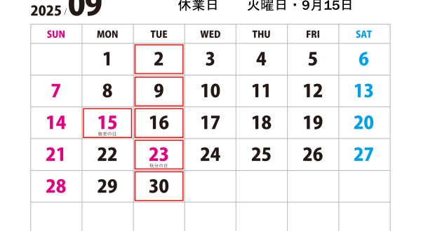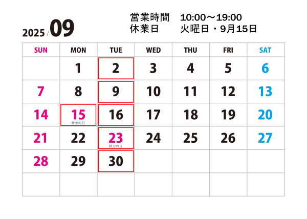 営業時間、休業日のお知らせ。2025年9月 cycleshoptanifuji2025-08-28 営業日のご案内タグ: お知らせ営業時間、休業日のお知らせ。2025年9月にコメントする 2025年9月は、火曜日と9/15がお休みとなります。 営業時間は 10:00 から 19:00 になります。 たくさんのご来店をお待ちしております。。